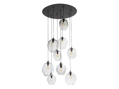 Introducing the Avenue Lighting Sonoma 9 Light Pendant Cluster, a stunning centerpiece that combines elegance with modern design. The Sonoma collection features a meteor-like melted glass shape that captivates your attention from the first glance. This exotic piece will draw you in with its unique design, making it a perfect addition to any spacious room, whether it be a grand dining area, a stylish hallway, or an open-concept living space.