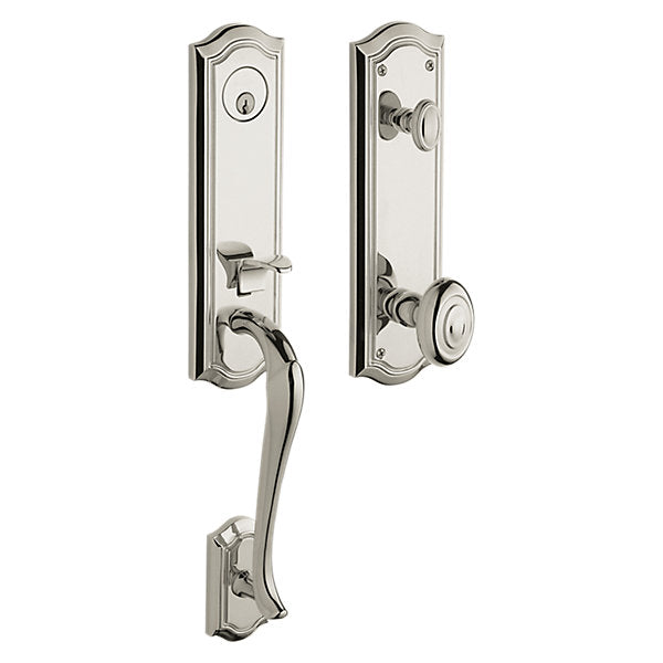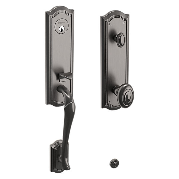 Introducing the Baldwin Bethpage Handleset with 5077 Knob, a stunning blend of traditional design and modern functionality. Finished in a lifetime satin nickel, this handleset not only enhances the aesthetic of your entryway but also promises lasting performance. Crafted from solid forged brass, it stands as a testament to Baldwin's commitment to quality and durability. With a high-grade steel strike accompanying the deadbolt, you can rest assured that your home is secure and stylish.