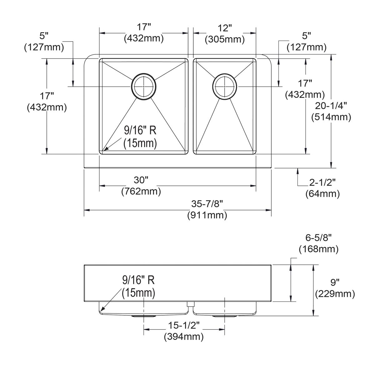- CABINET SIZE: Minimum cabinet size for this sink is 36".