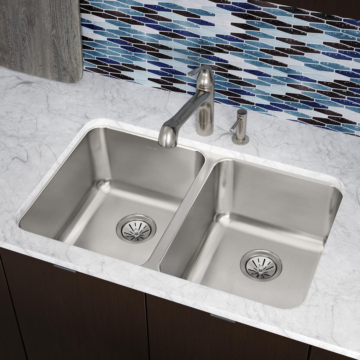 Introducing the Elkay Lustertone Classic 31-1/4" x 20" x 9-7/8" Equal Double Bowl Undermount Sink, a beautiful fusion of functionality and aesthetics. This stunning stainless-steel sink is designed to elevate your kitchen, laundry room, or bar area. Its sleek, undermount design creates a seamless look that enhances your countertop and delivers exceptional performance for all your washing, soaking, and rinsing needs. With its durable finish and practical features, this sink is not just a utility item but a stylish addition to your home.