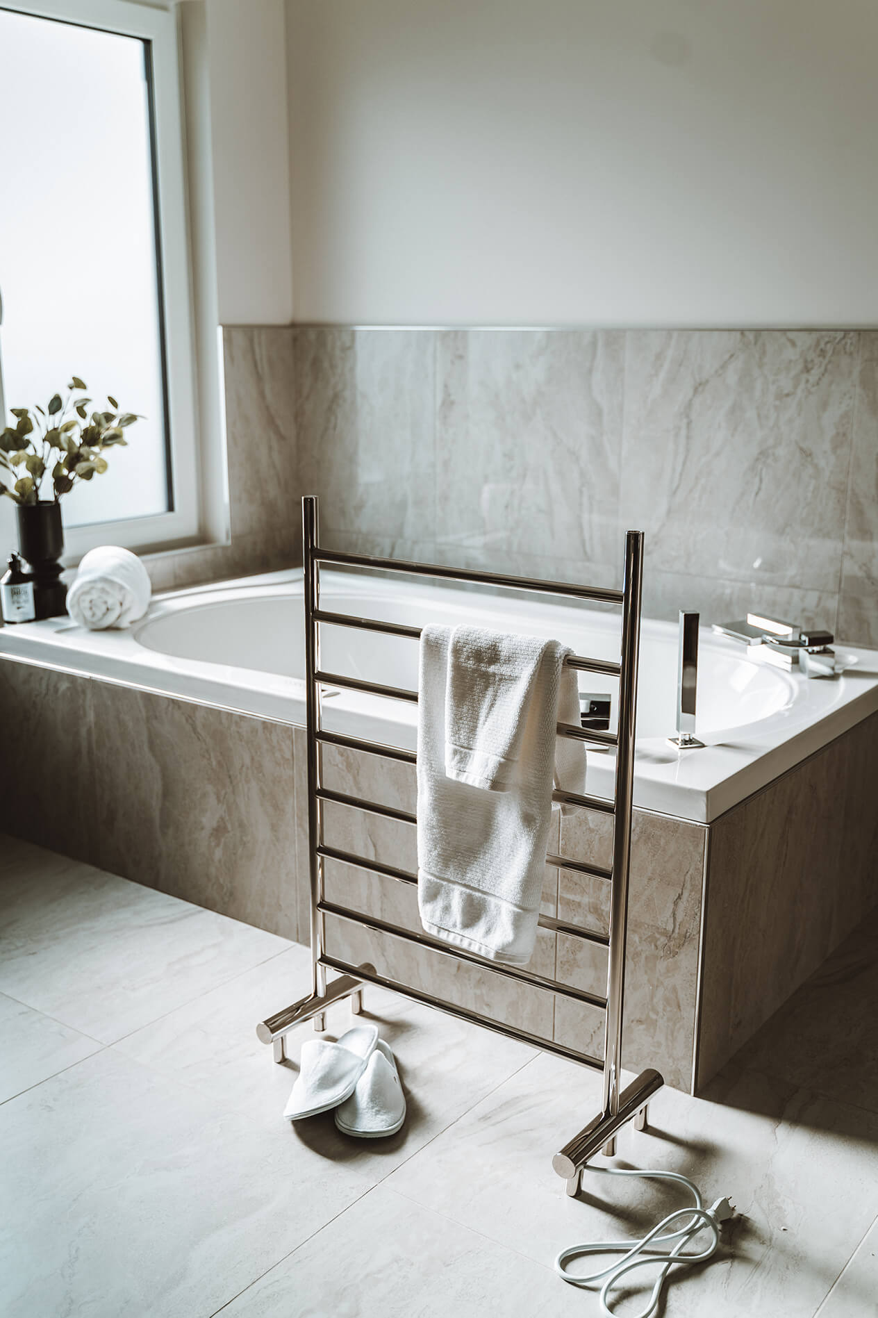Lightweight and free-standing, the Camber conveniently plugs into any room, creating a warm and inviting atmosphere. Perfect for those chilly mornings, this towel warmer combines functionality with style, making it an essential addition to your home. Elevate your comfort today with ICO Bath's exquisite craftsmanship!