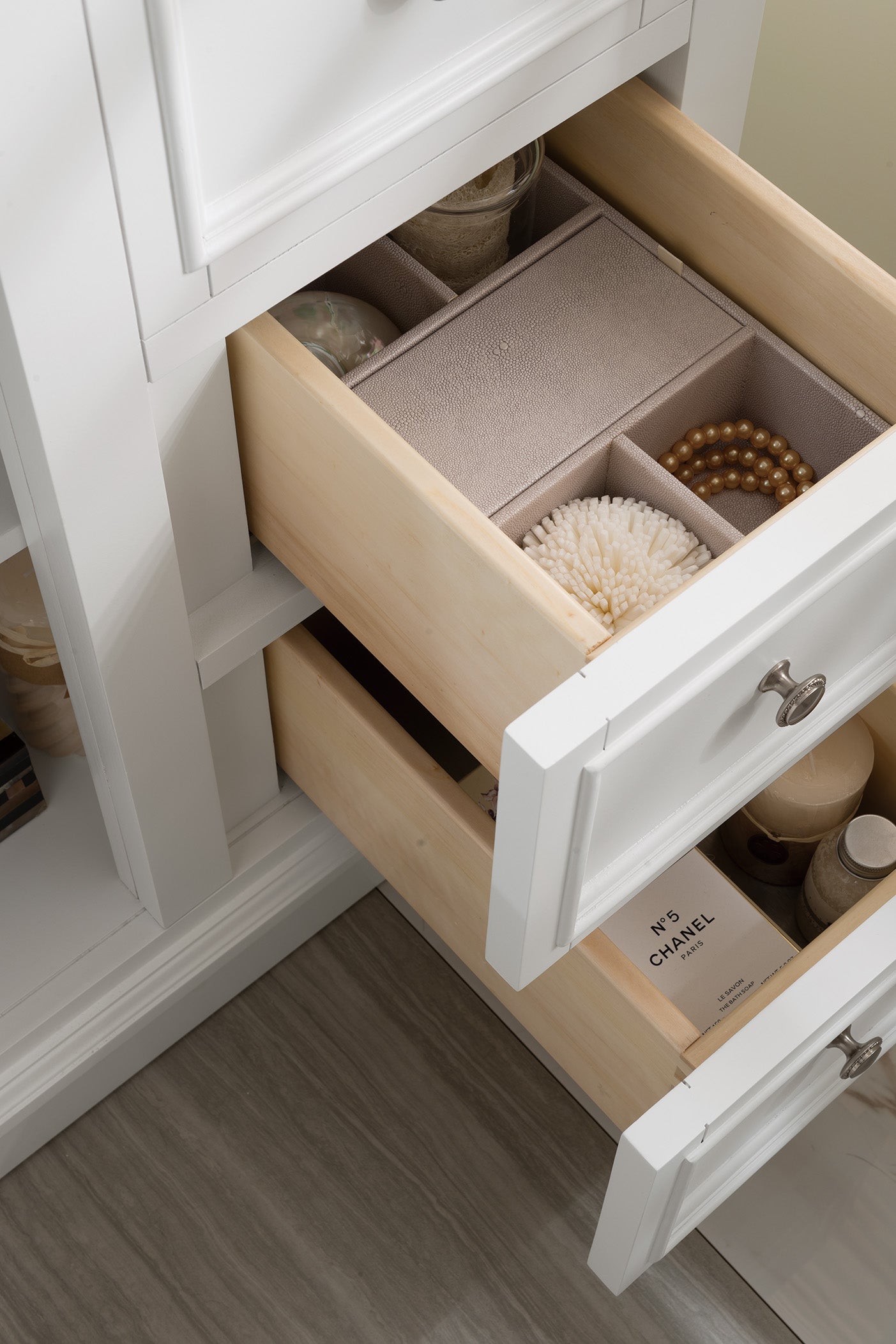With its full plinth base behind the rounded bracket feet, this vanity not only looks great but is also easy to maintain. Elevate your bathroom experience with the James Martin Vanities De Soto 30" Single Vanity - Bright White. Order yours today and transform your space with this perfect blend of style and utility!