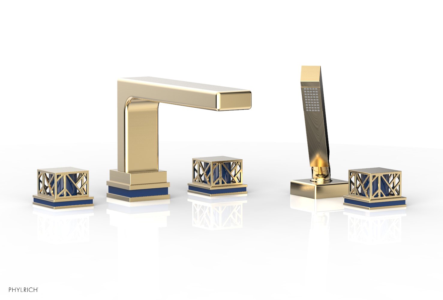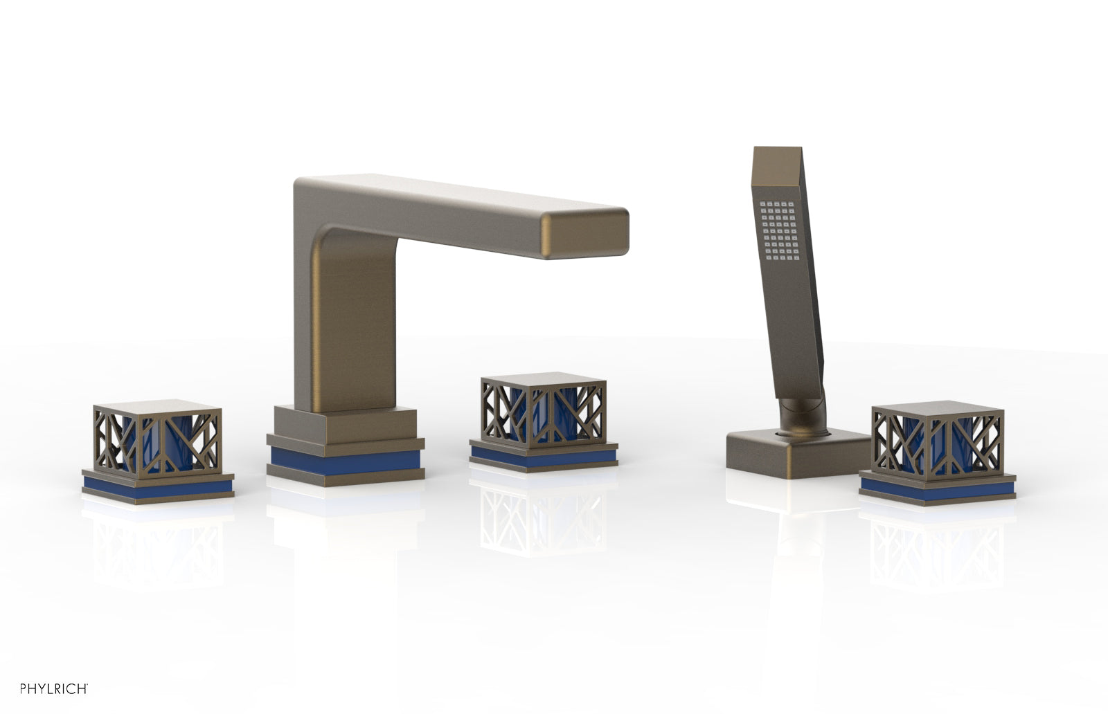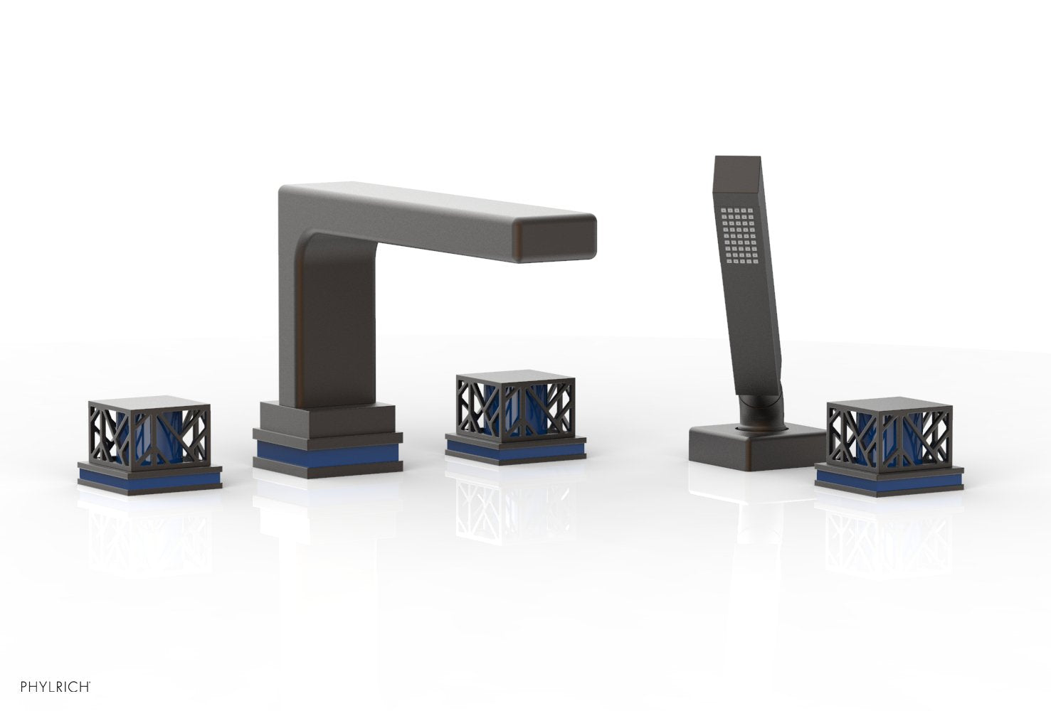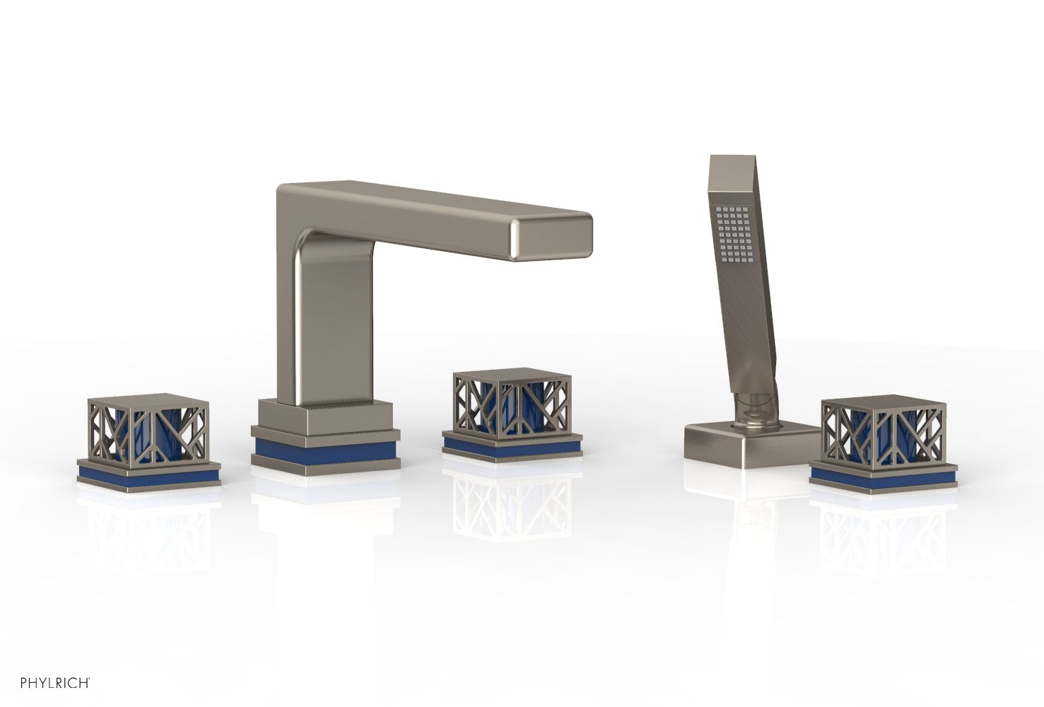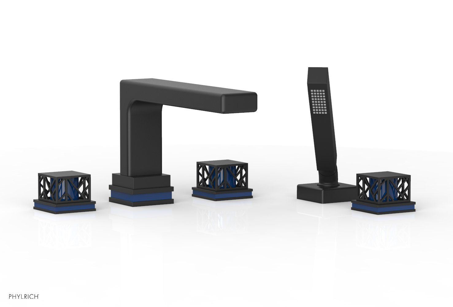 About The Phylrich JOLIE Deck Tub Set with Hand Shower - Square Handles with "Navy Blue" Accents